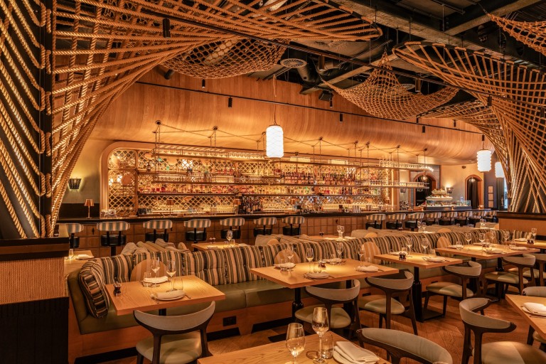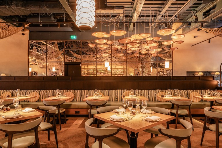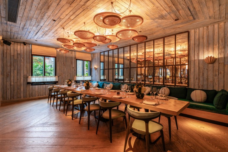 Entering the light-filled restaurant space, guests will be greeted by the sight of a striking 16m bar with seating, running the length of the restaurant. This bar will comprise a Raw Bar, filled with the freshest fish and seafood, a glowing cocktail bar where talented mixologists craft an array of signature cocktails, and a pizza counter at the far end. A private dining space at the back of Azzurra features warm wooden walls and ceilings, roughly painted to evoke old fishing boats.